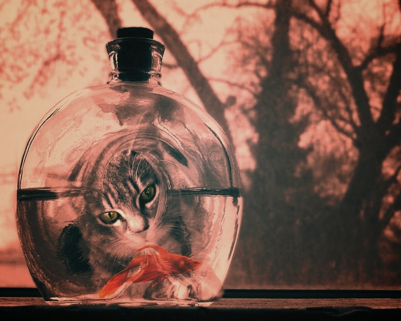 «Кот наблюдает за рыбкой в бутылке»