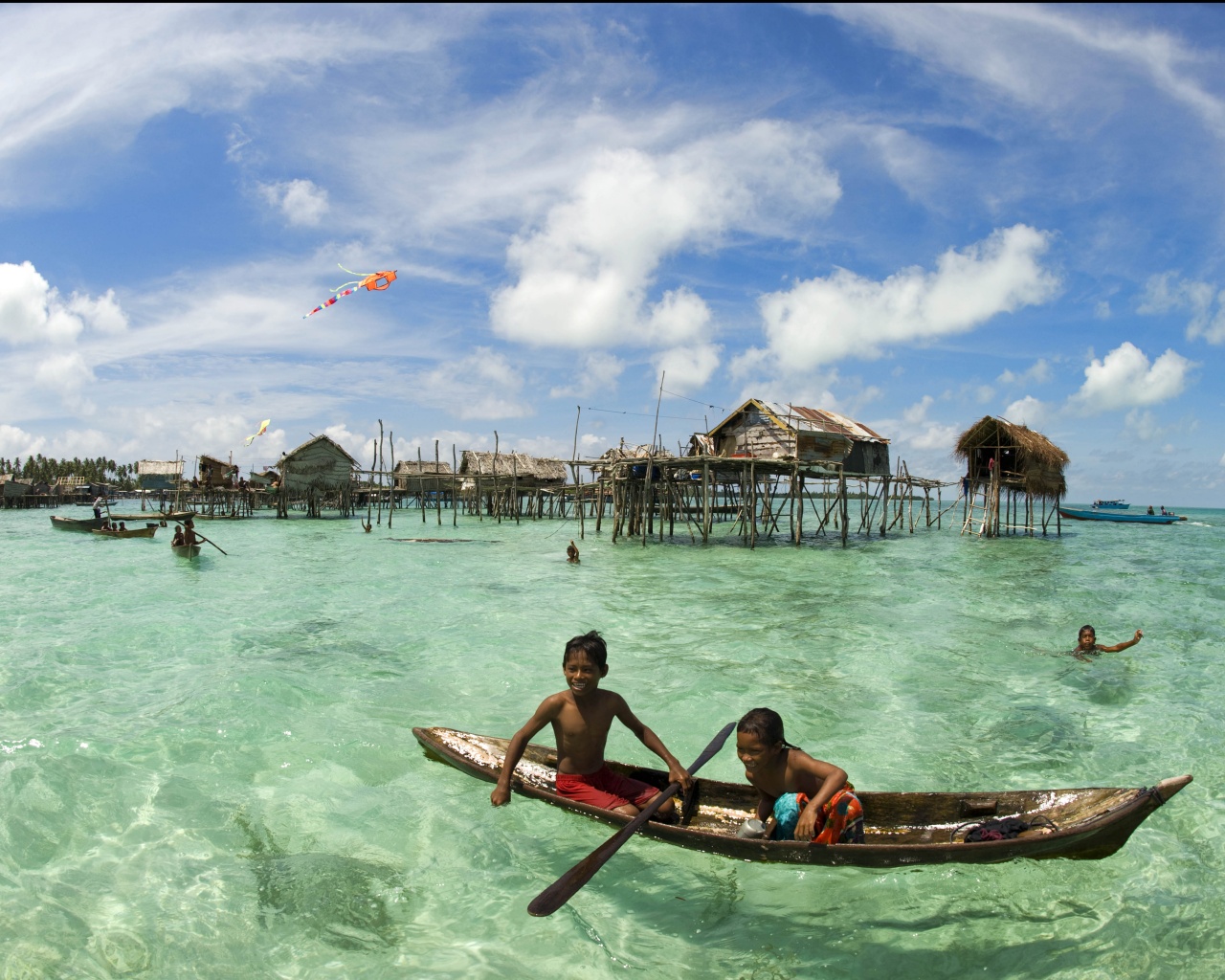 «Дети в лодке у поселения туземцев»