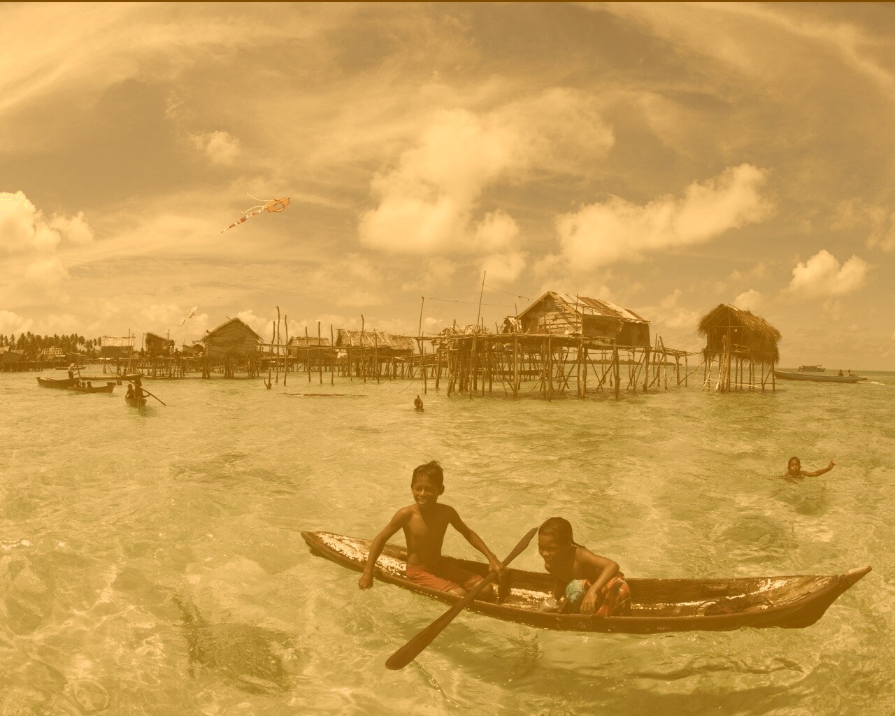 «Дети в лодке у поселения туземцев»