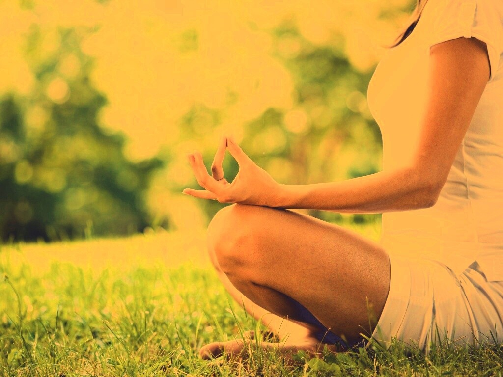 «Девушка медитирует в позе лотоса на траве»