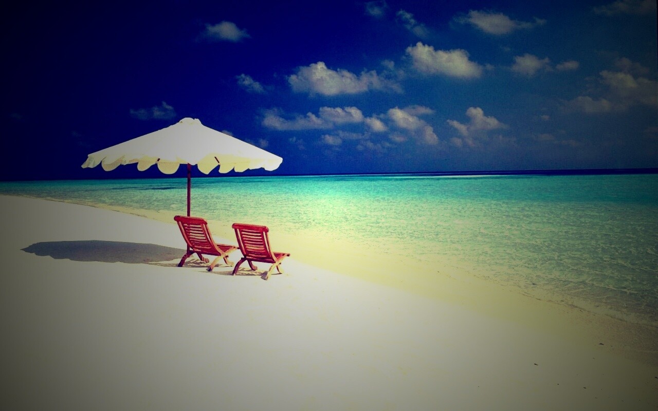«Песчаный пляж с двумя жезлонгами»