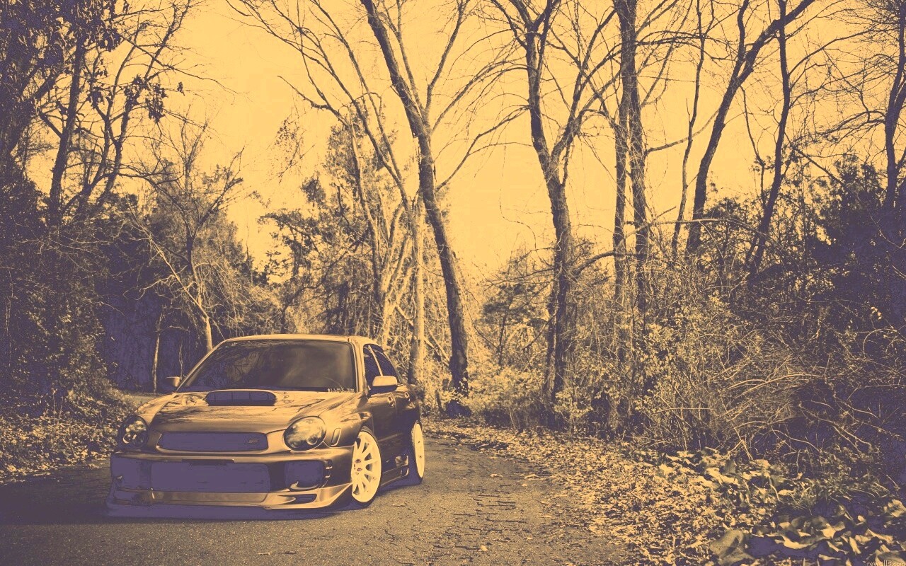 Обои для рабочего стола «Субару Импреза на лесной дороге» 1280х800 с фильтром nashville (оригинал 2560х1600)