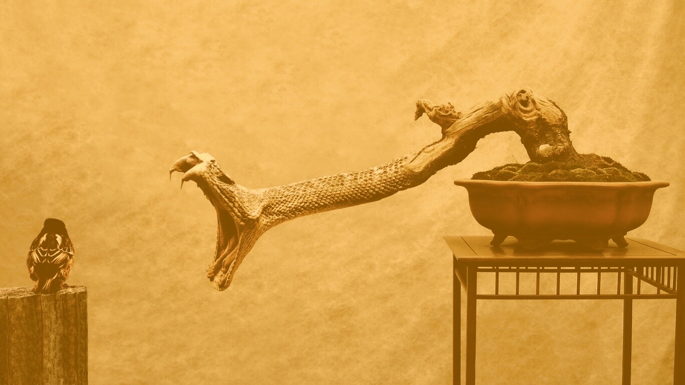 «Змея-коряга напдает на птичку»