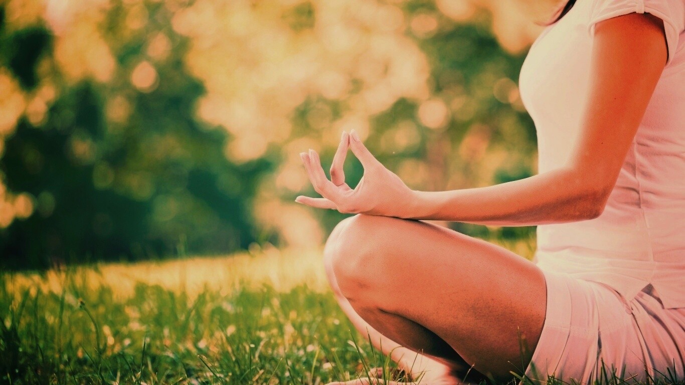 «Девушка медитирует в позе лотоса на траве»