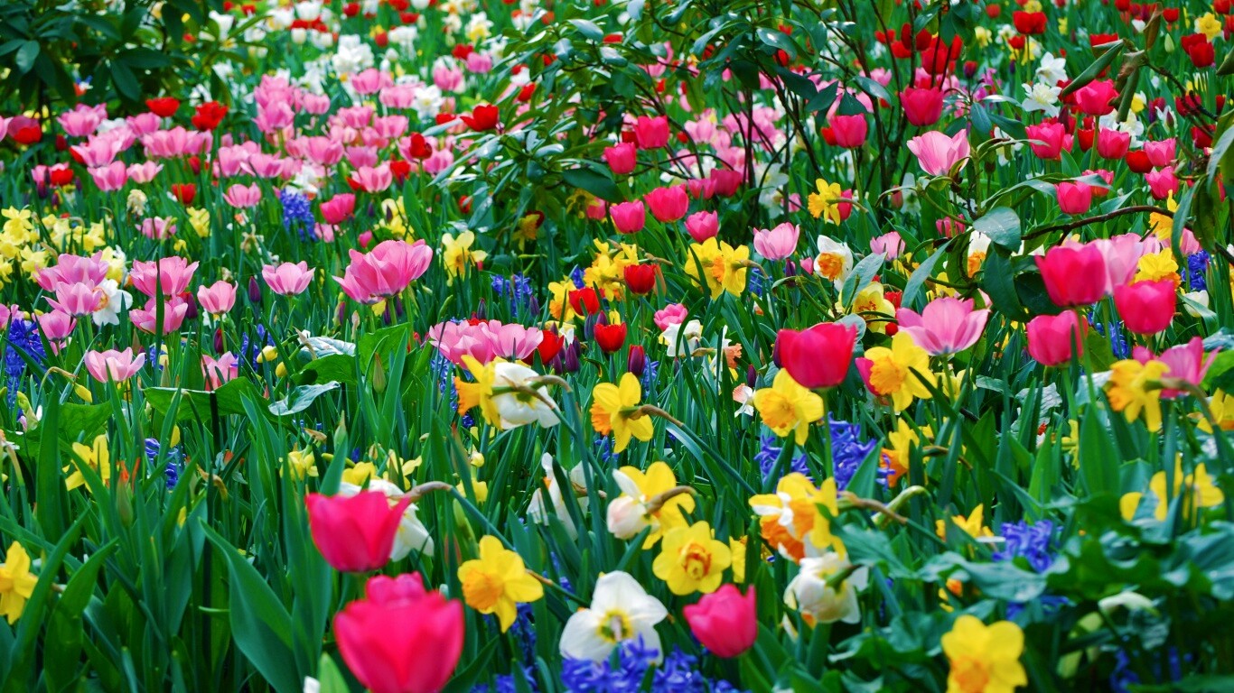 Обои для рабочего стола «Поляна со множеством цветов» 1366х768 с фильтром vibrance (оригинал 3872х2592)