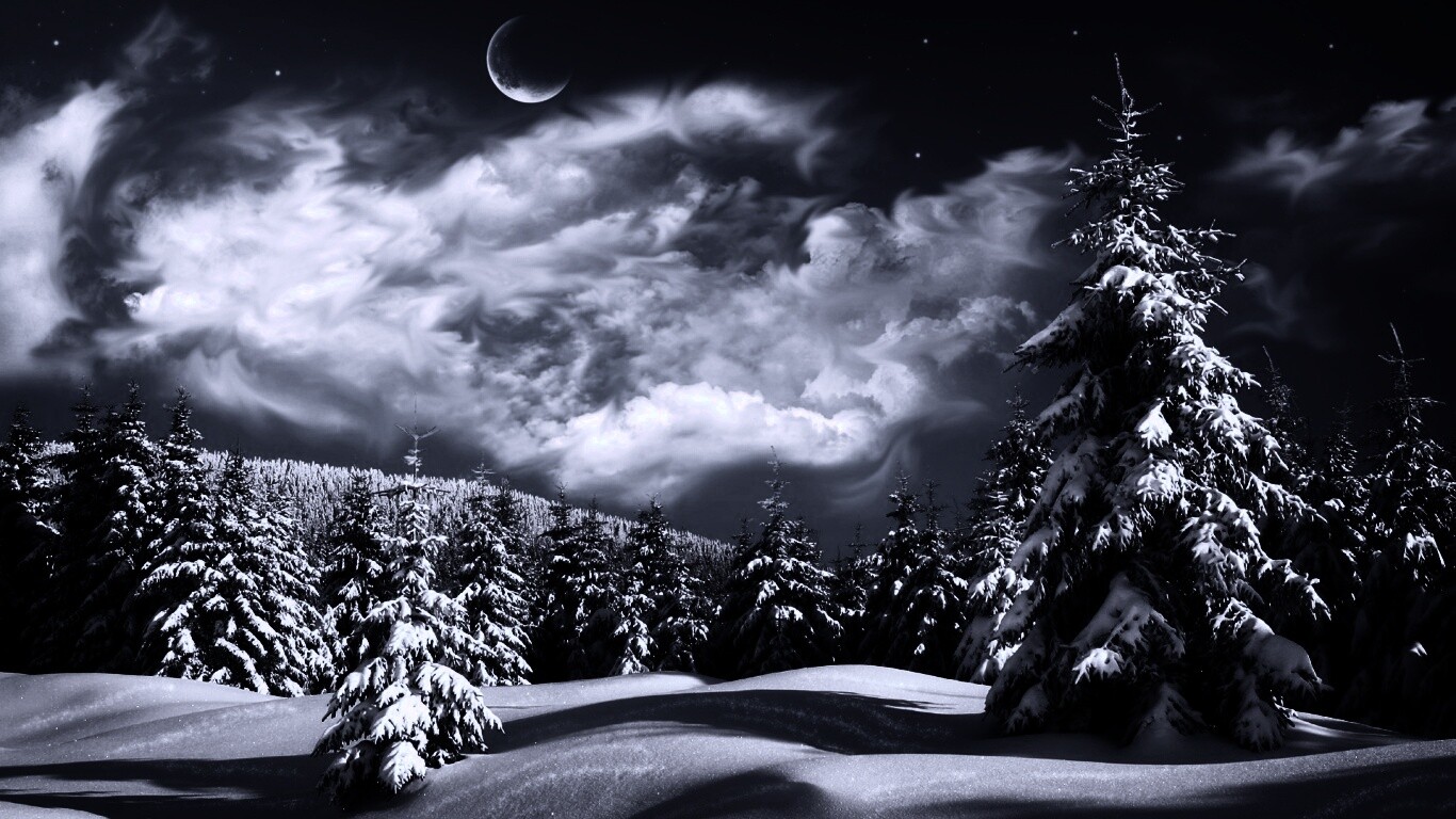 Обои для рабочего стола «Зимний еловый лес» 1366х768 с фильтром gotham (оригинал 1920х1080)