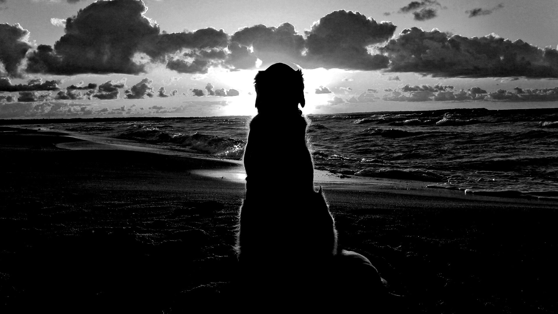 «Собака наблюдающая закат на пляже»