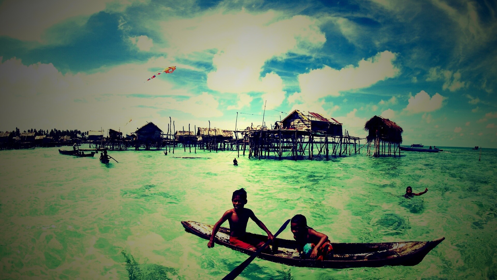 «Дети в лодке у поселения туземцев»