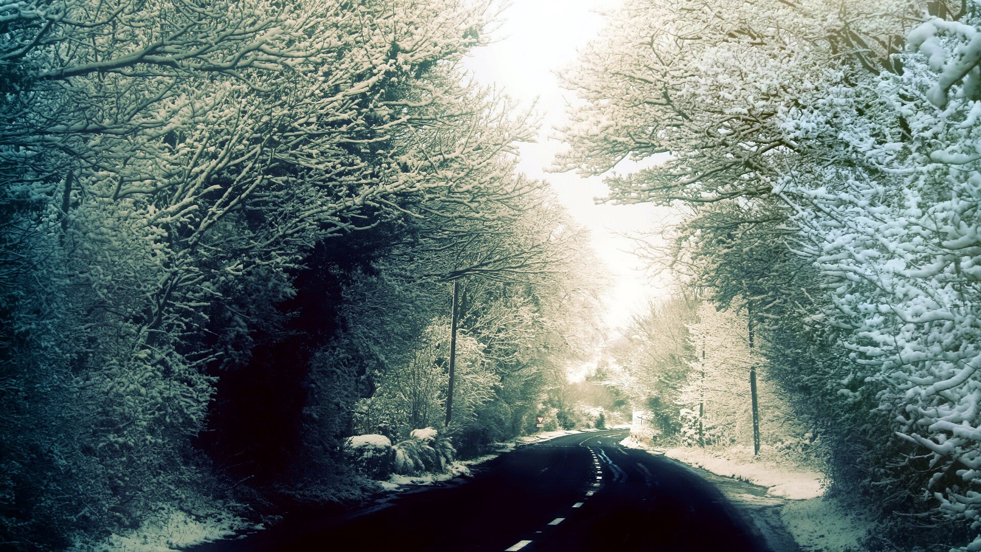 Обои для рабочего стола «Дорога через зимний лес» 1920х1080 с фильтром vibrance (оригинал 2560х1600)