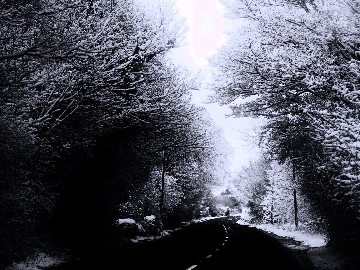 Обои для рабочего стола «Дорога через зимний лес» 1152х864 с фильтром gotham (оригинал 2560х1600)