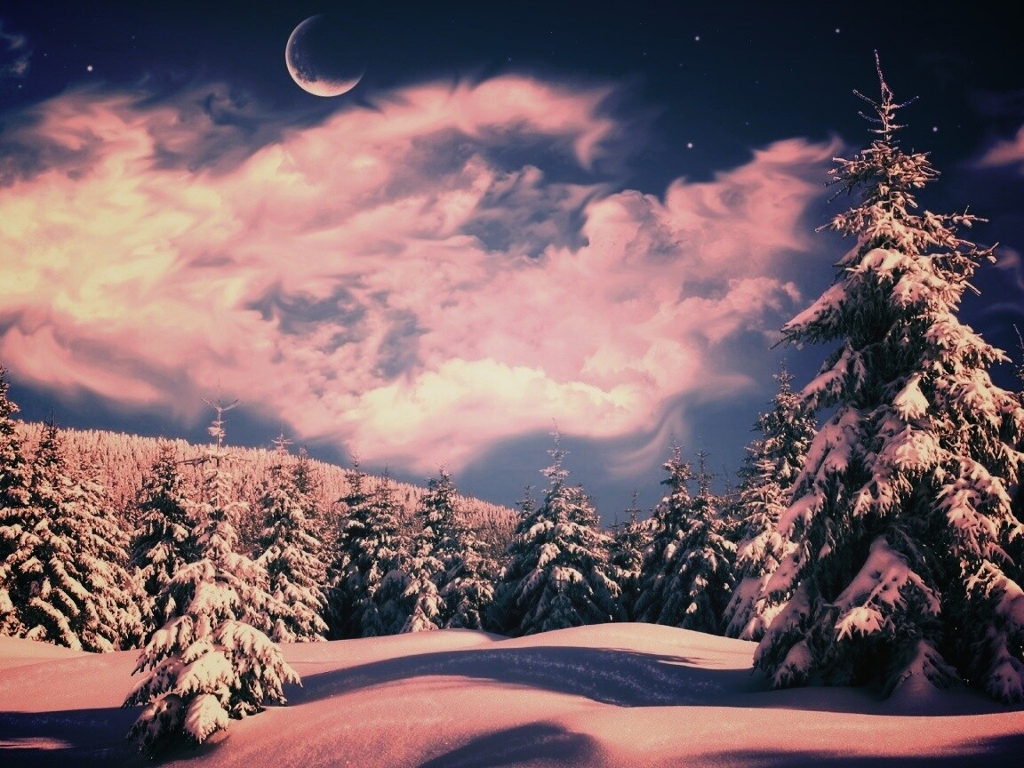 Обои для рабочего стола «Зимний еловый лес» 1152х864 с фильтром earlybird (оригинал 1920х1080)