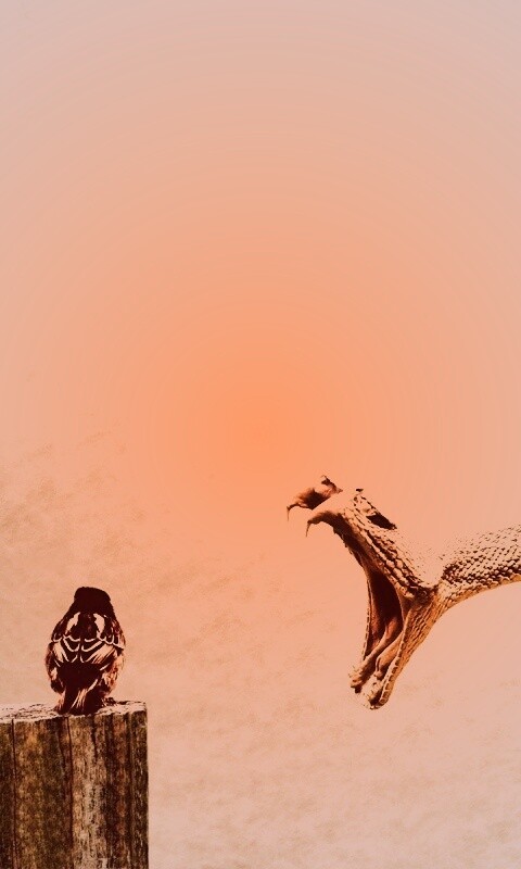«Змея-коряга напдает на птичку»