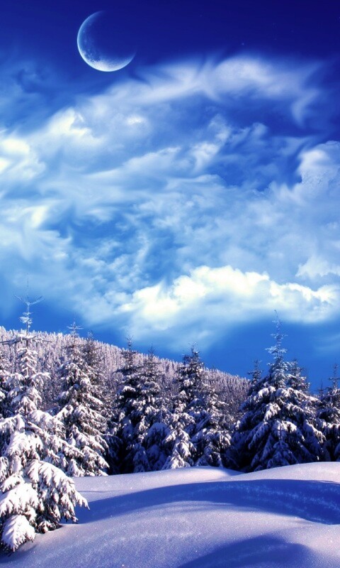 Обои для рабочего стола «Зимний еловый лес» 480х800 с фильтром vibrance (оригинал 1920х1080)