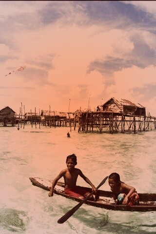 «Дети в лодке у поселения туземцев»