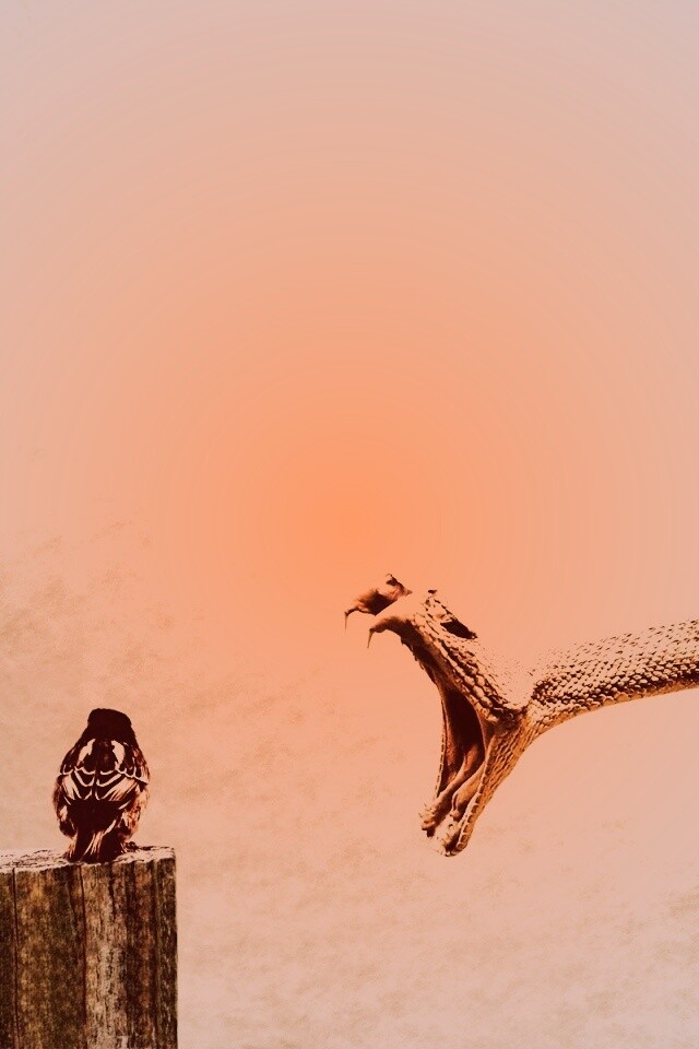 «Змея-коряга напдает на птичку»