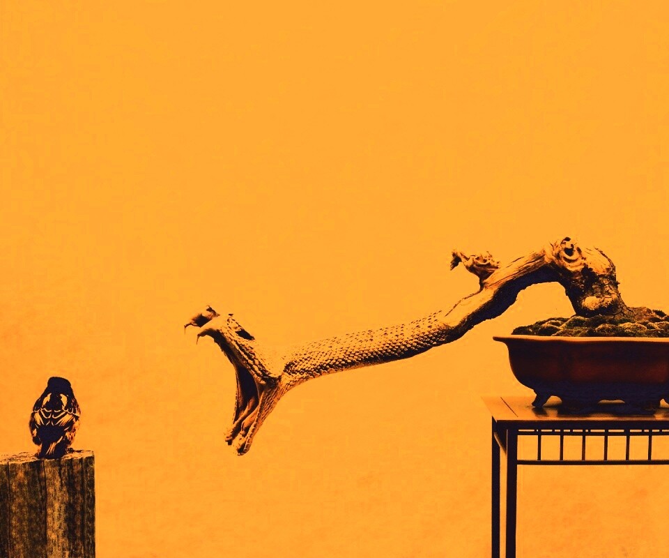 «Змея-коряга напдает на птичку»