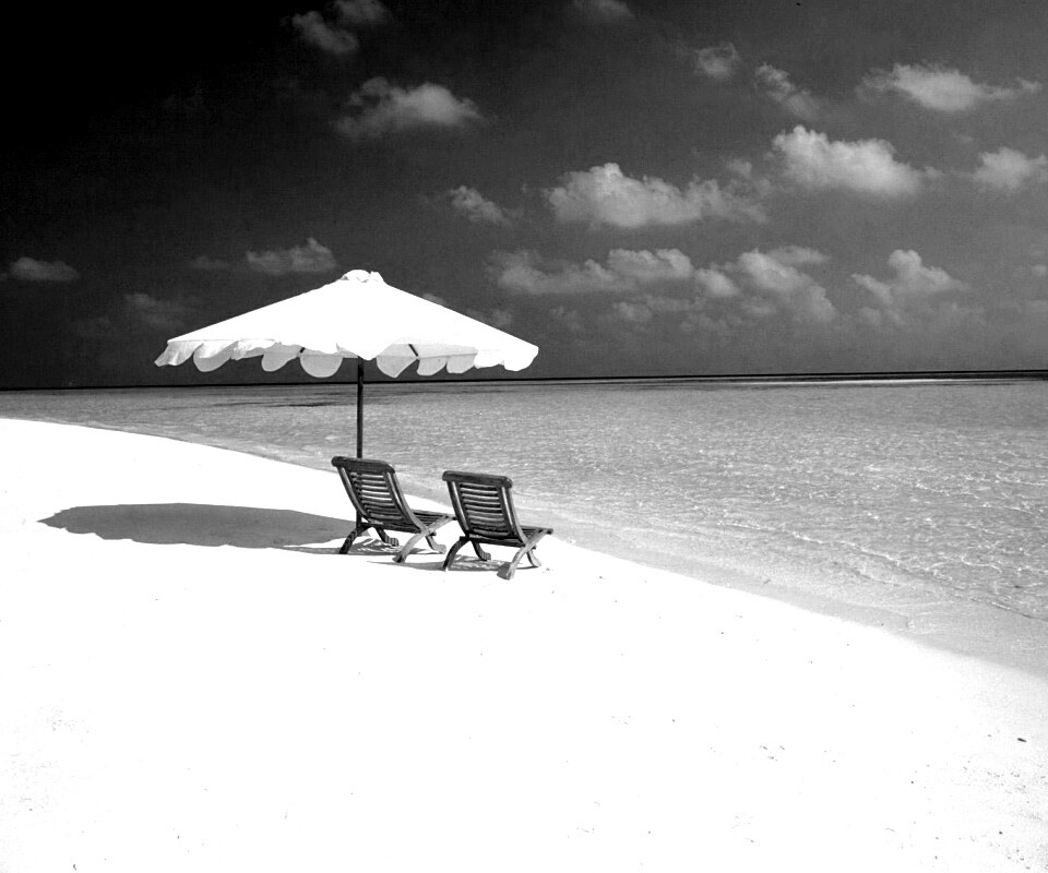 «Песчаный пляж с двумя жезлонгами»