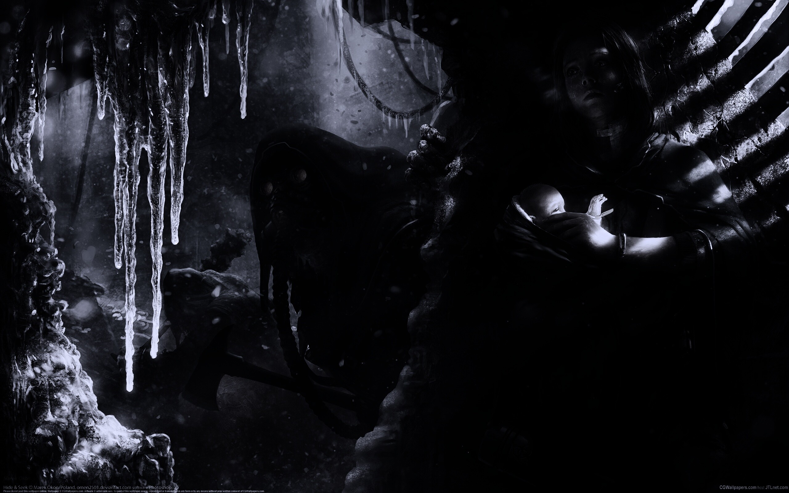 «Девушка с ребенком прячется от монстра»