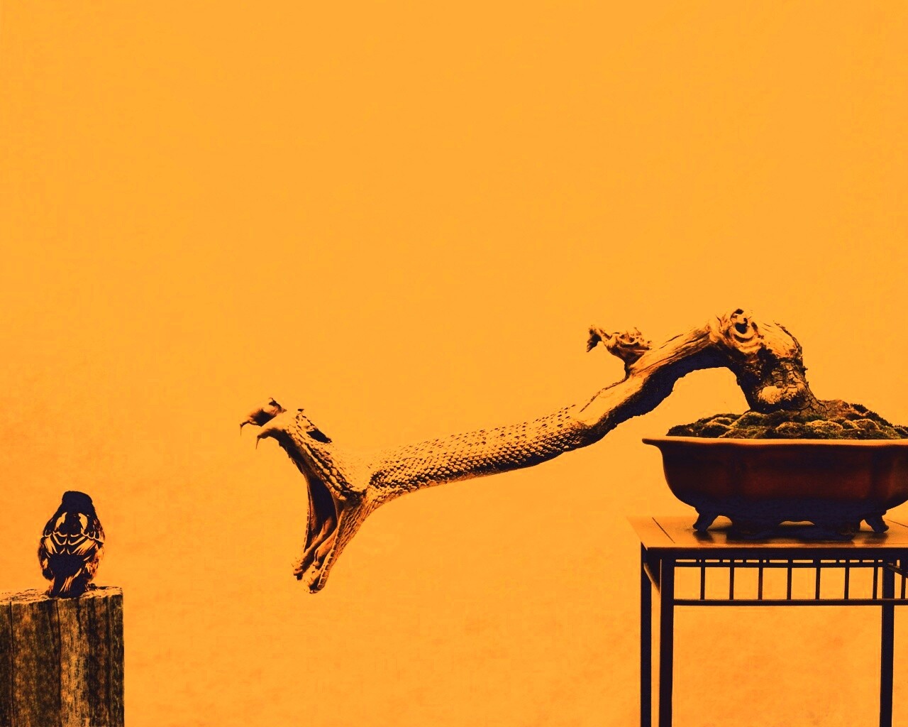 «Змея-коряга напдает на птичку»