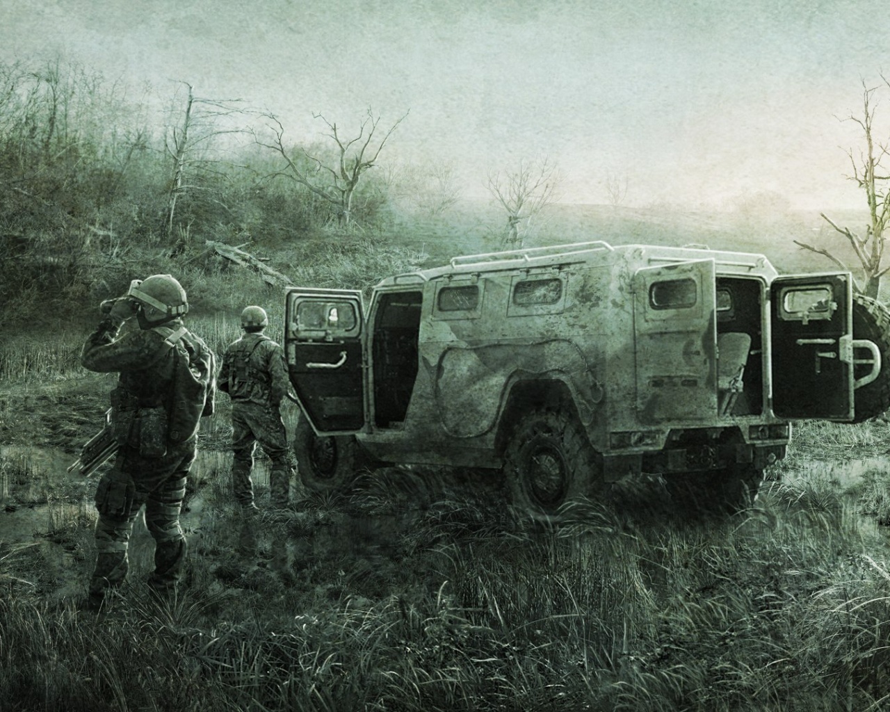«Солдаты из сталкера на болоте»
