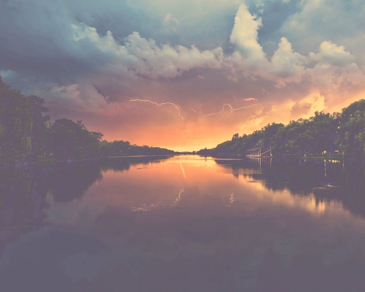 «Молнии на фоне заката, стандартные обои mac»