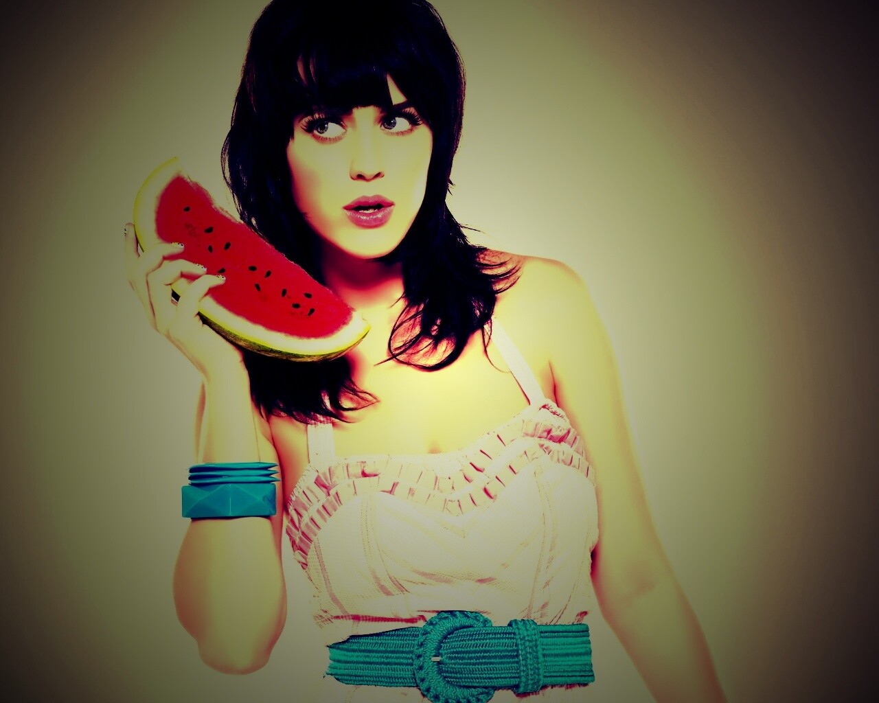 Обои для рабочего стола «Кэти Пэри и арбуз» 1280х1024 с фильтром lomo (оригинал 2560х1600)