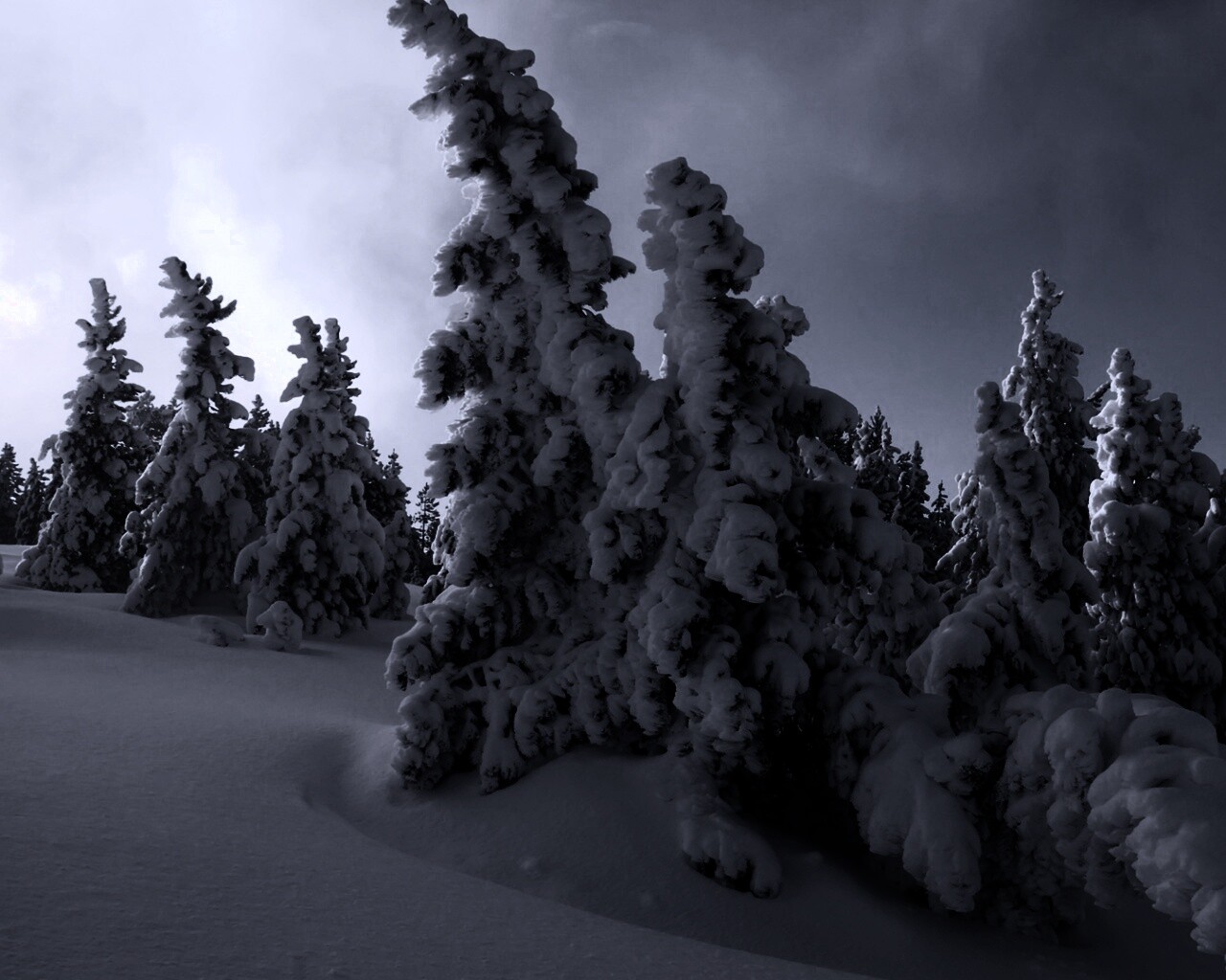 Обои для рабочего стола «Ели в снегу» 1280х1024 с фильтром gotham (оригинал 1920х1080)