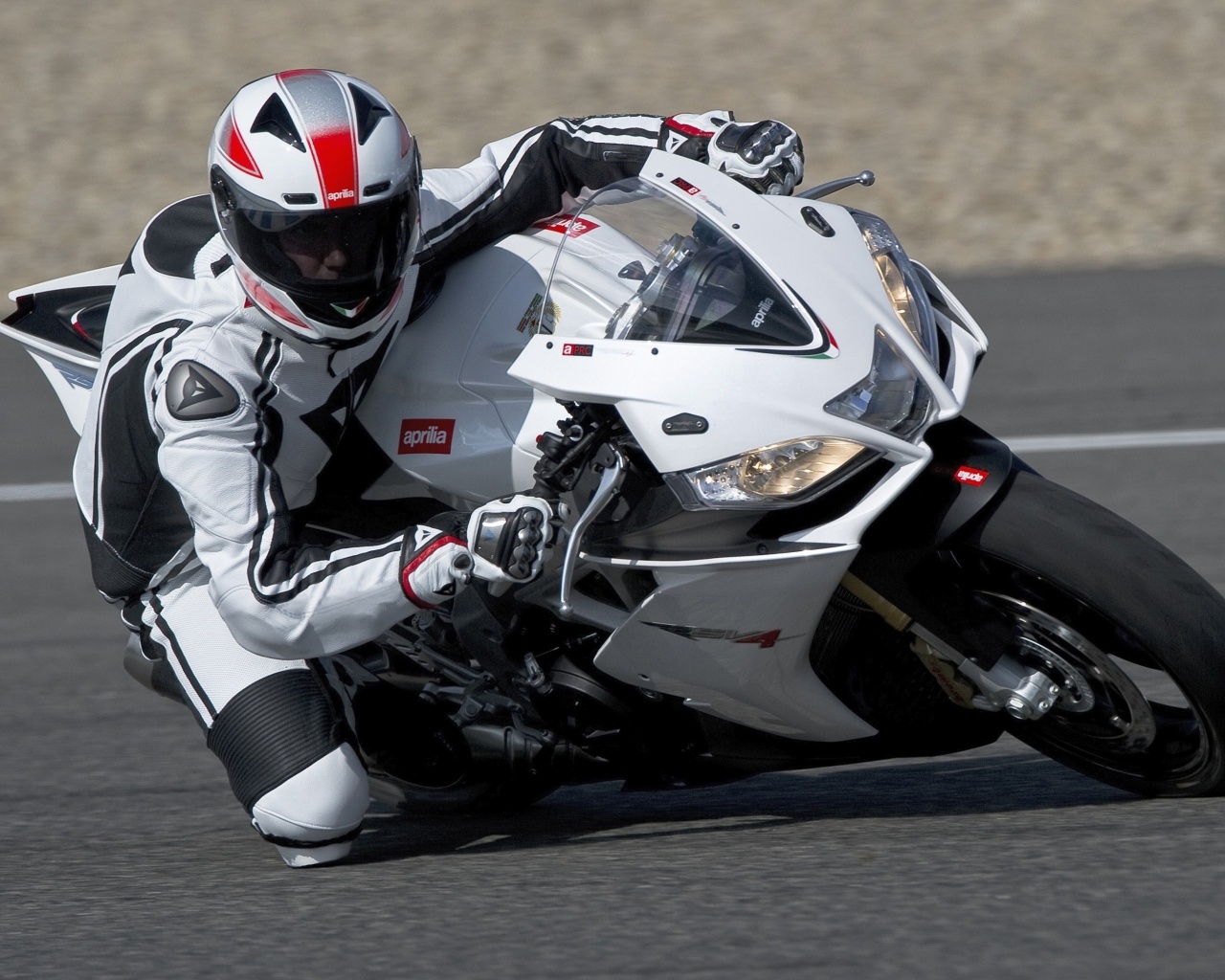 «Байкер в белой экиперовкена Априлия РСВ4»