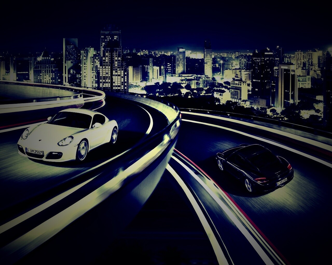 «Черный и белый Porsche на автомагистрале.»