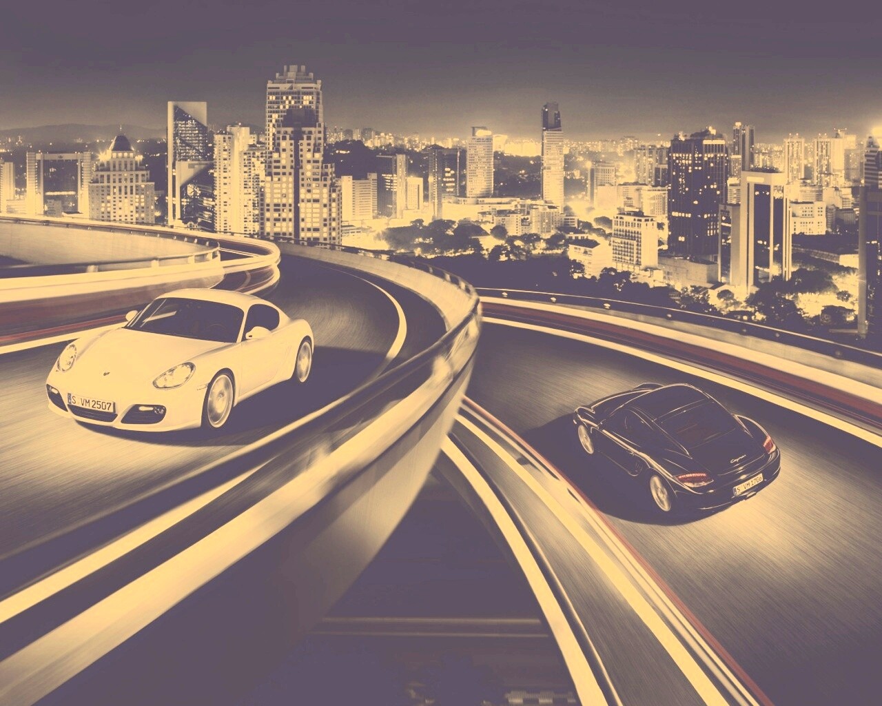 «Черный и белый Porsche на автомагистрале.»