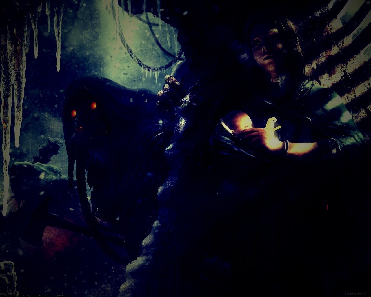 «Девушка с ребенком прячется от монстра»