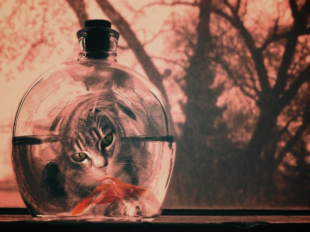 «Кот наблюдает за рыбкой в бутылке»