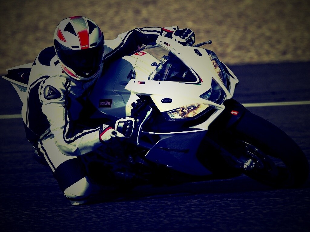 «Байкер в белой экиперовкена Априлия РСВ4»