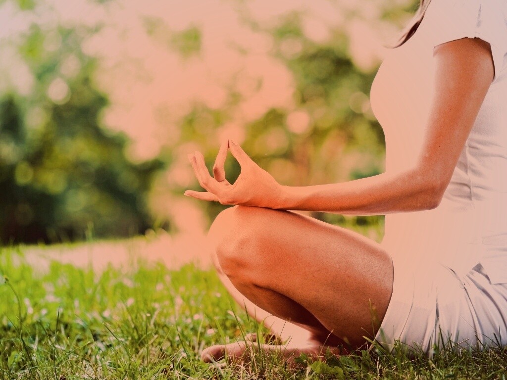 «Девушка медитирует в позе лотоса на траве»