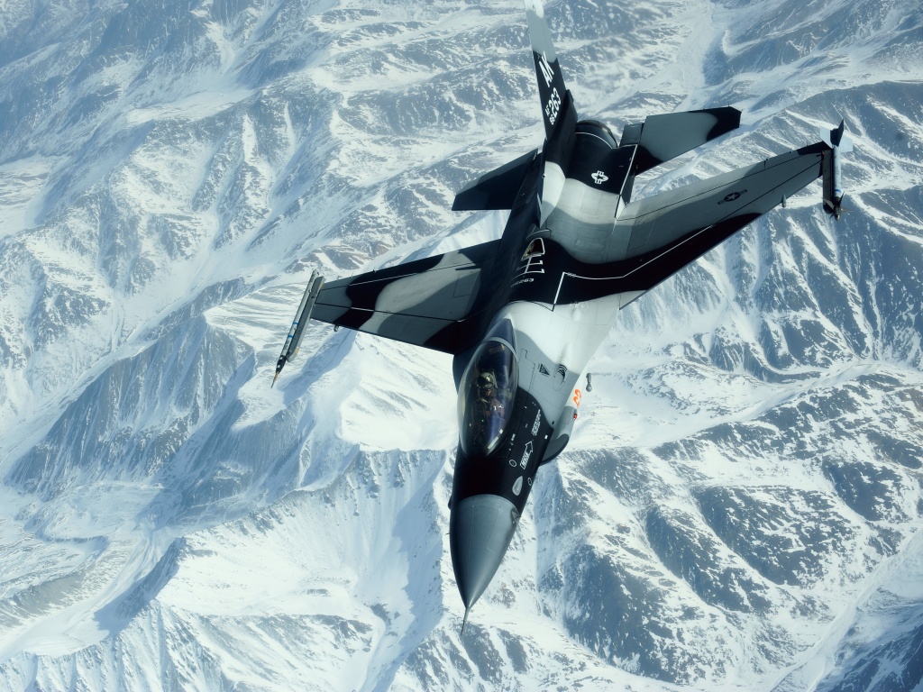 Обои для рабочего стола «Истребитель над снежными пиками гор» 1024х768 (оригинал 4256х2832)