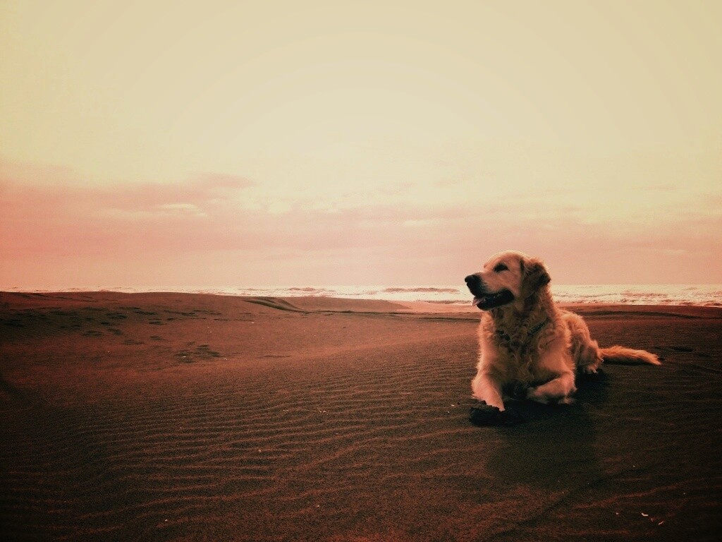 «Красивая собака на оранжевом песке»