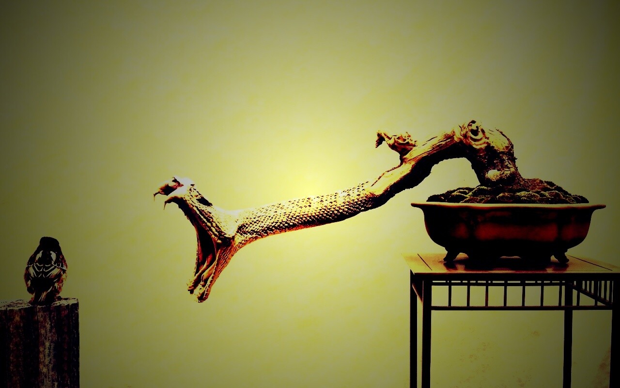 «Змея-коряга напдает на птичку»