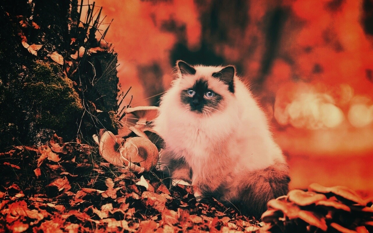 «Пушистый кот среди пожелтевшей листвы»