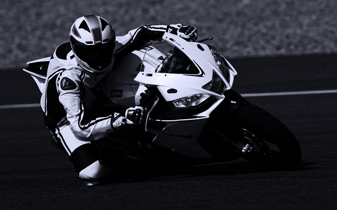 «Байкер в белой экиперовкена Априлия РСВ4»