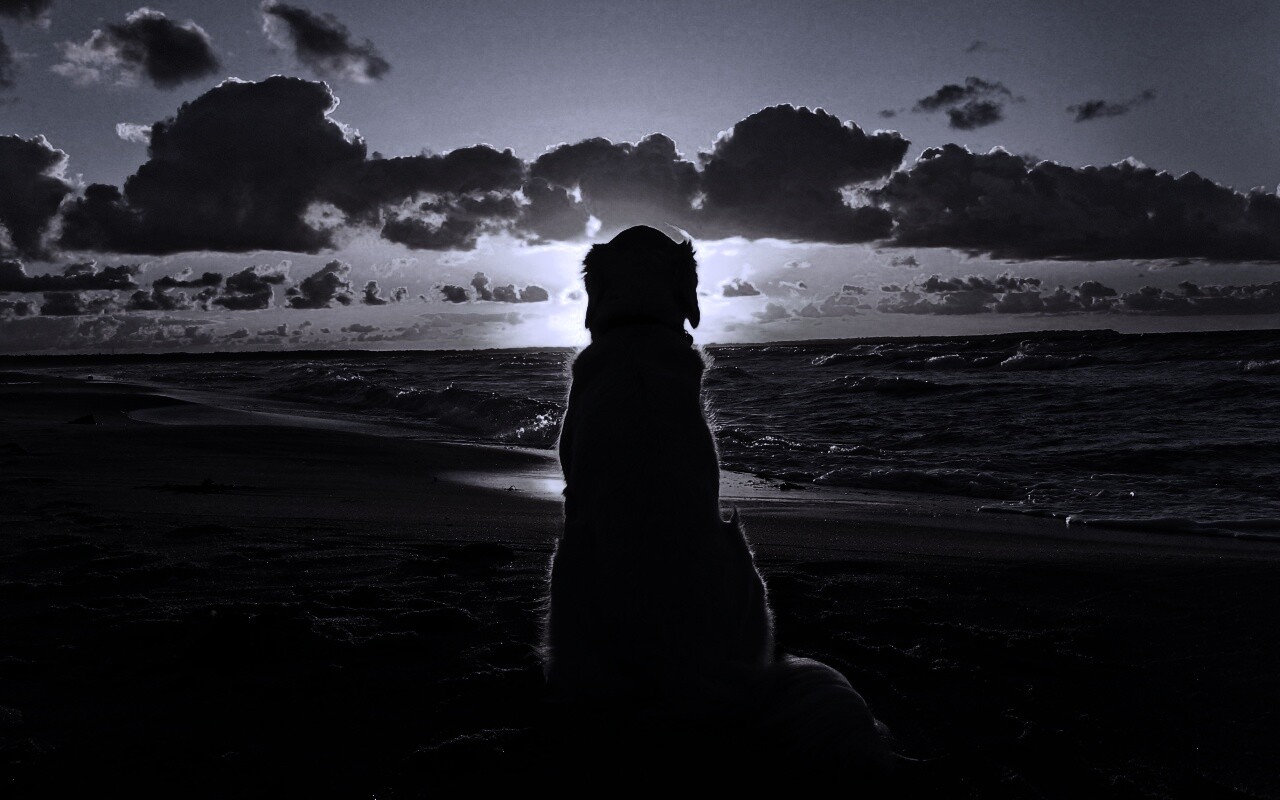 «Собака наблюдающая закат на пляже»