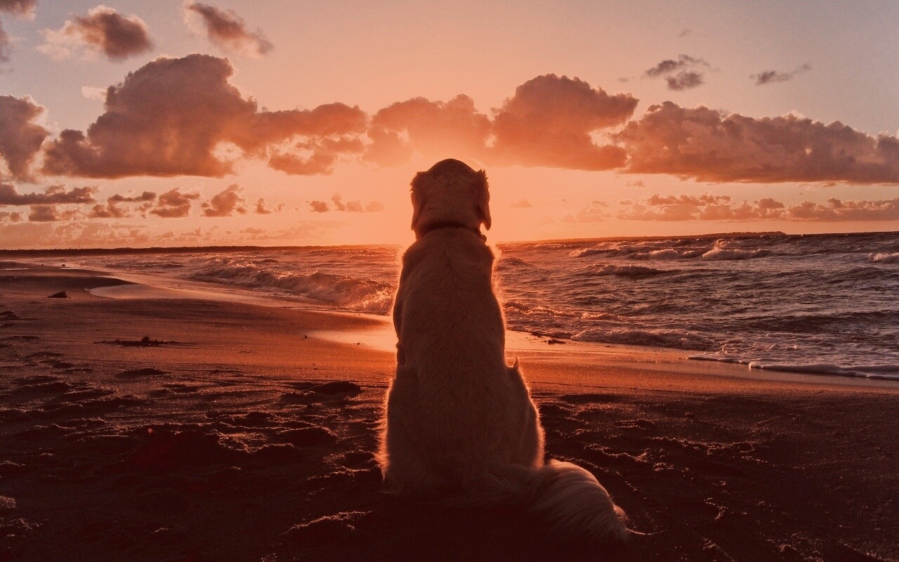 «Собака наблюдающая закат на пляже»