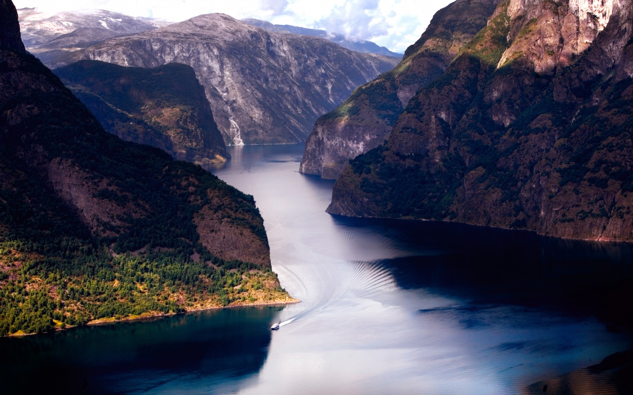 «Лодка на реке среди высоких гор»