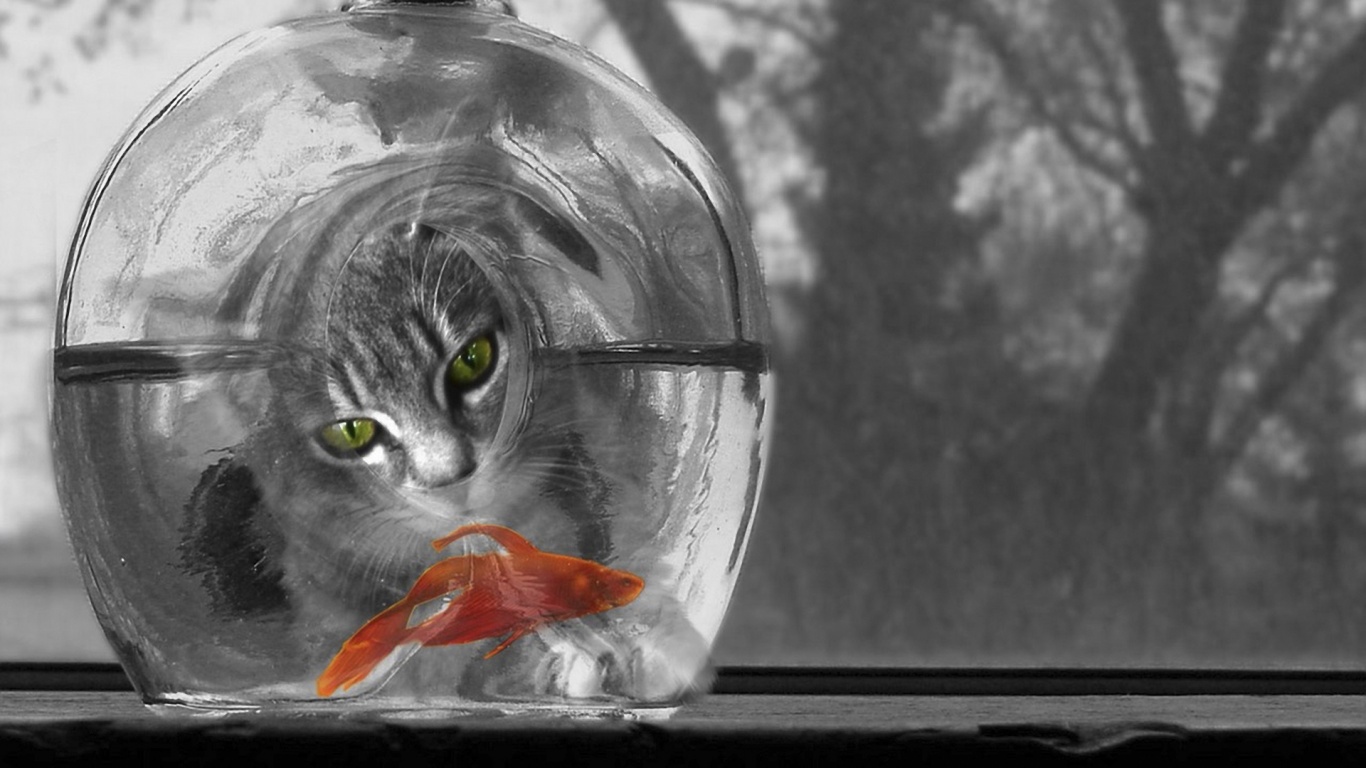 «Кот наблюдает за рыбкой в бутылке»