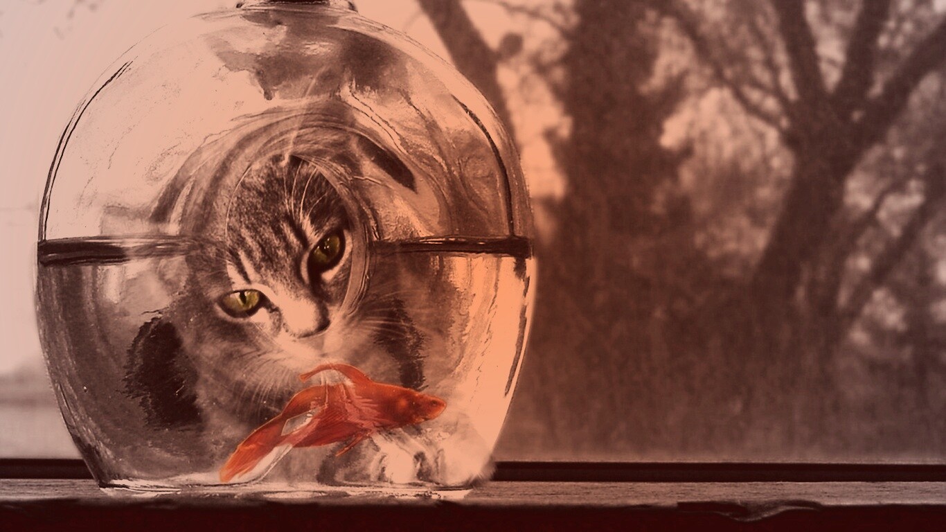 «Кот наблюдает за рыбкой в бутылке»