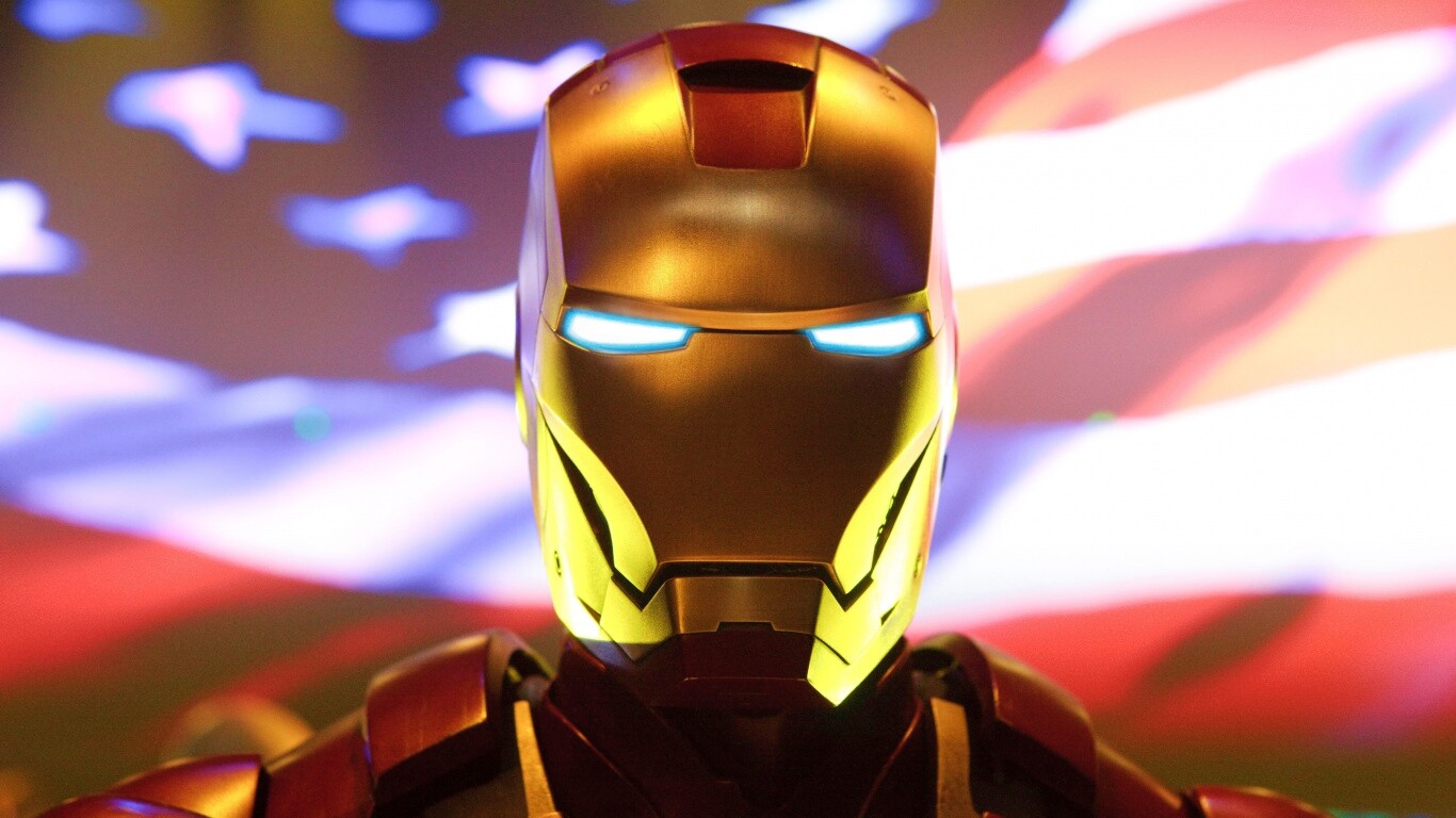 Обои для рабочего стола «Железный человек на фоне американского флага» 1366х768 с фильтром vibrance (оригинал 3999х2666)
