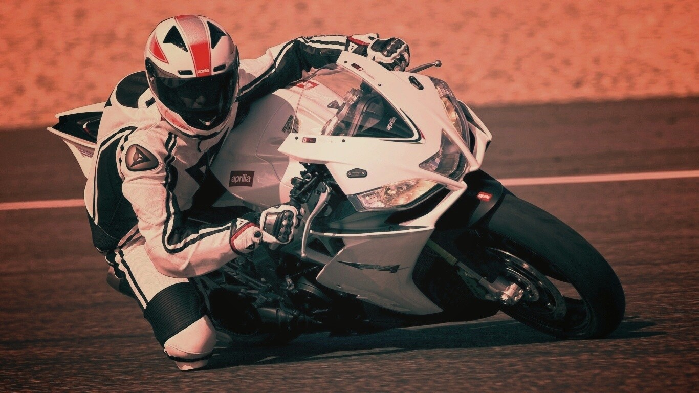 «Байкер в белой экиперовкена Априлия РСВ4»