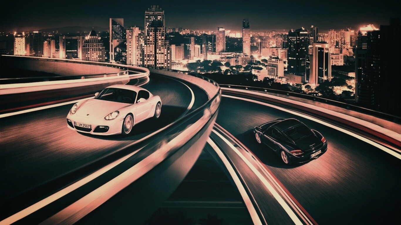 «Черный и белый Porsche на автомагистрале.»