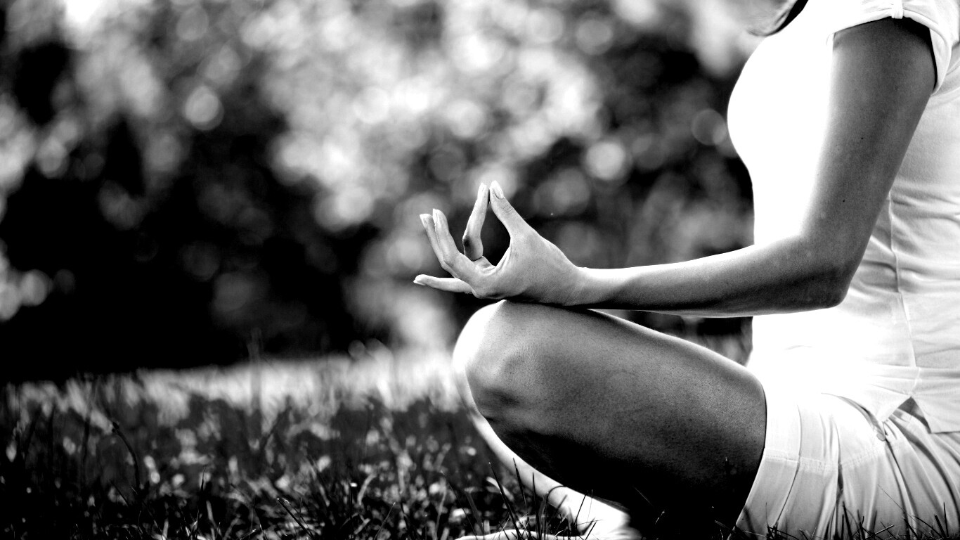 «Девушка медитирует в позе лотоса на траве»
