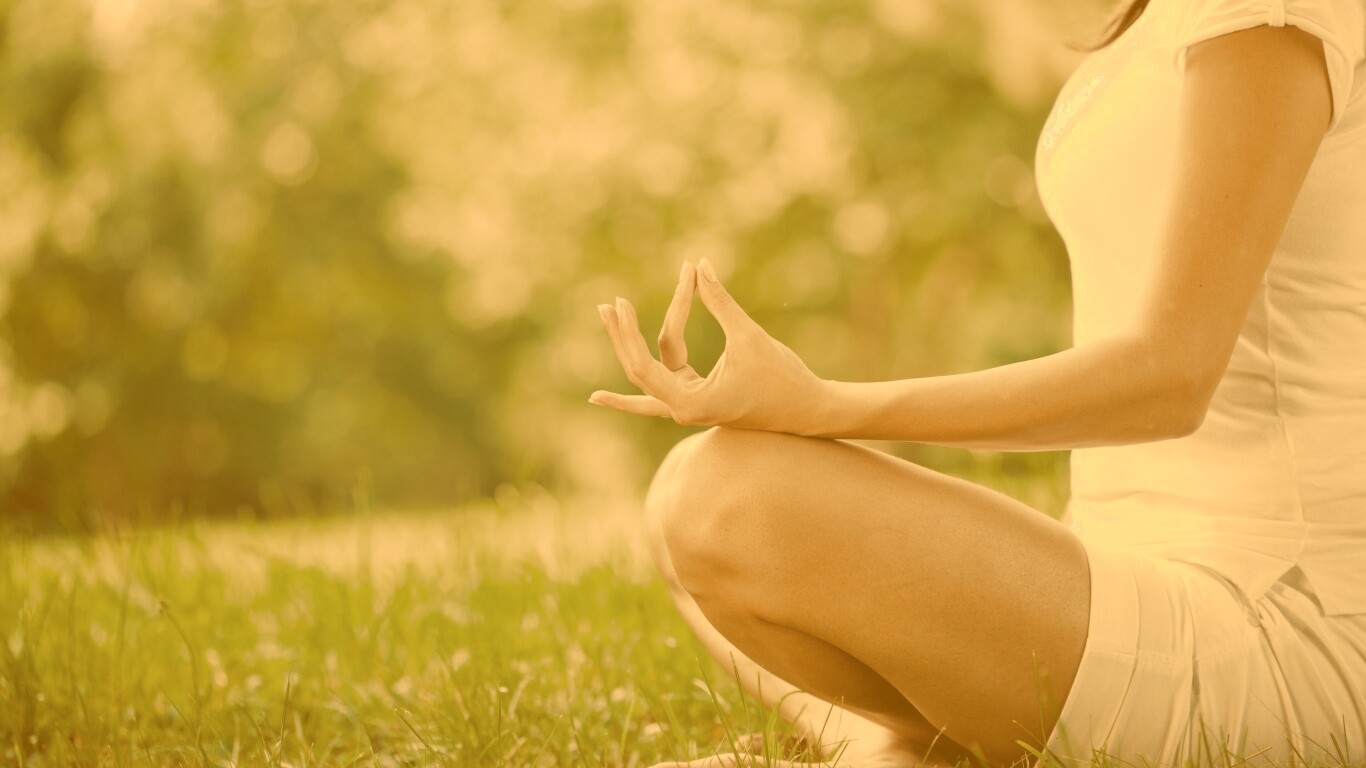 «Девушка медитирует в позе лотоса на траве»