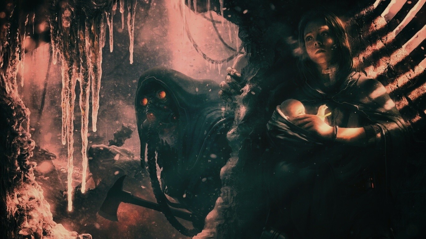 «Девушка с ребенком прячется от монстра»